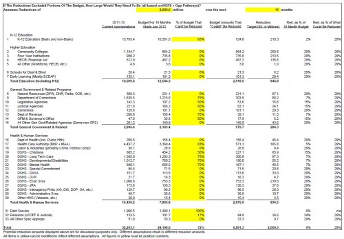 We start with about a $32 billion 2-year budget that runs from July 1 2011 to June 30 2013. There is no practical way we can make significant cuts before January 1, and even that will be difficult for a variety of reasons mostly having to do with antiquated computer systems and legal notification requirements, so you only get to cut from the last 18 months of the biennium, or about $24 billion.