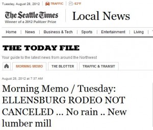 Today all legislators and a host of media outlets got a message that looked official enough to fool the Seattle Times into briefly publishing it on their website – that the Ellensburg Rodeo had been cancelled due to the Taylor Bridge fire. (It has not.) I might have believed it if I had not gotten a similar email every year from (presumably) the same guy for much of the last decade. For some reason he doesn’t like the rodeo, which I hear is great fun.