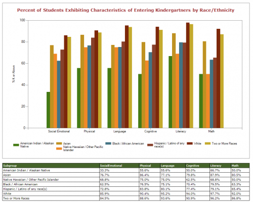 the most effective long-term way to approach the problem. The white kids in Seattle are much more likely to be more economically advantaged than children of color, and are consequently much more likely to have access to high quality preschool. The chart to the left shows the scores in the Seattle School District on an assessment Washington State does for every entering Kindergartner broken down by race and ethnicity. These kids are 5 years old and you can see significant differences in their development.